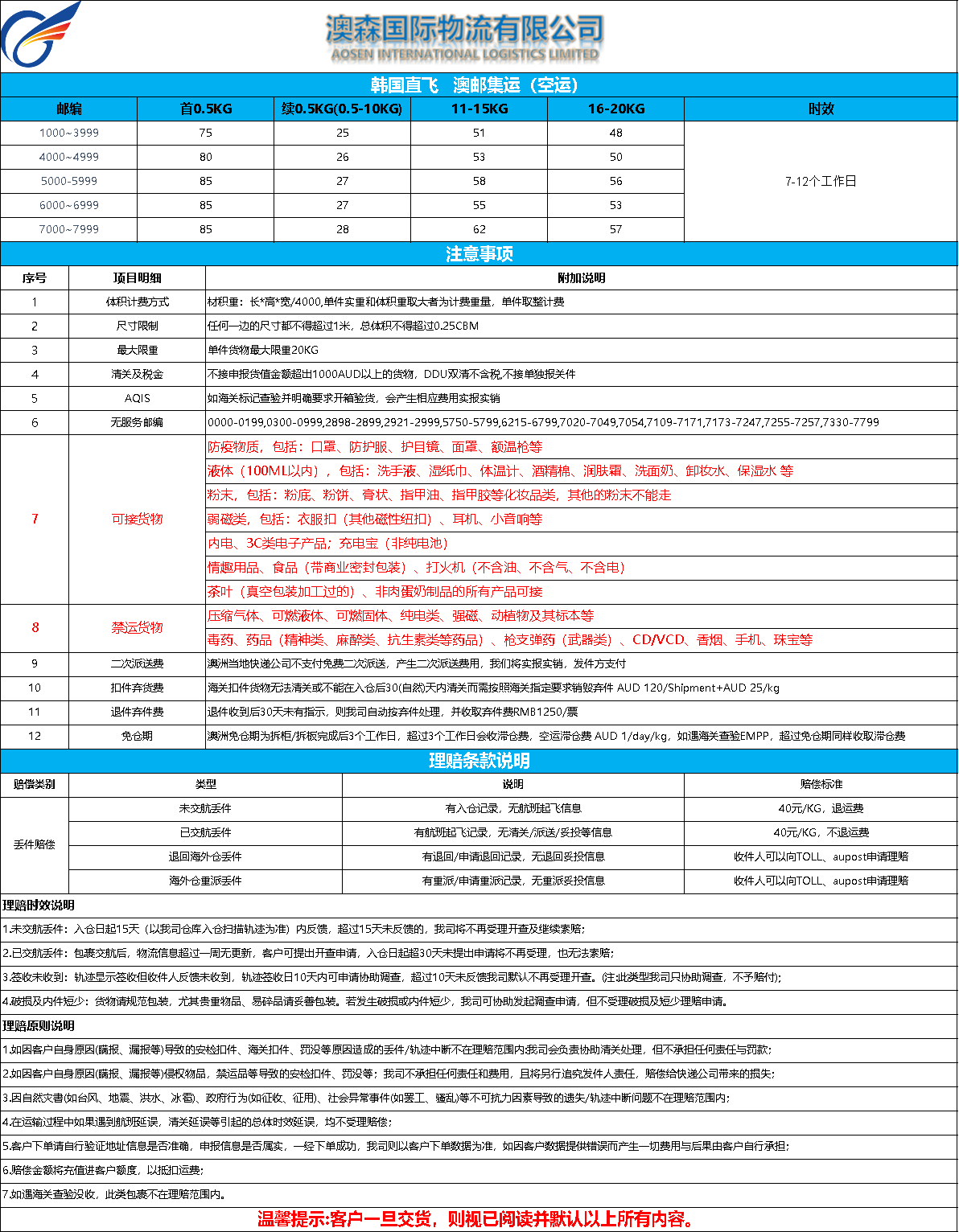 澳洲空派集运(澳邮)报价
