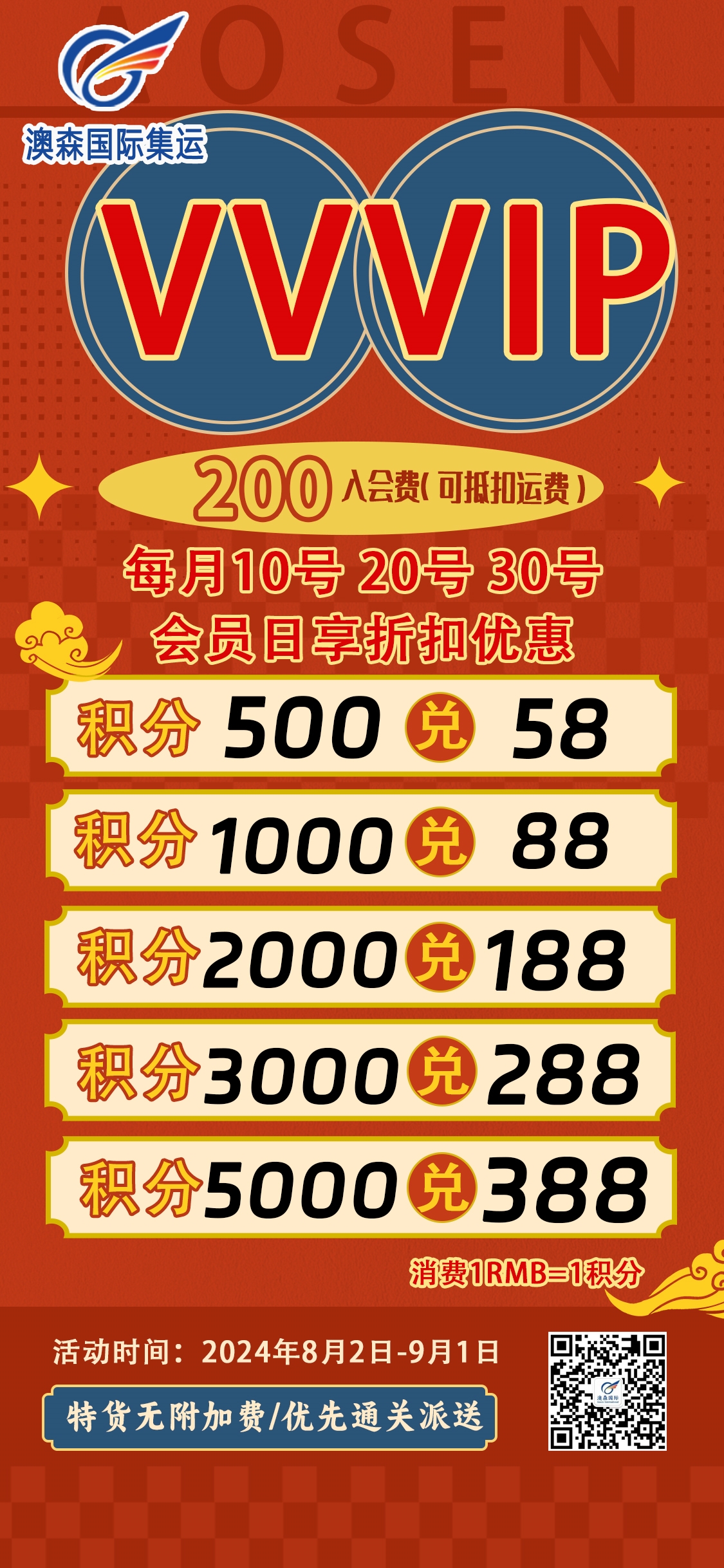 特色福利: 200 元成为 VIP👑,会员费直抵运费,最高抵 500 元,集运成本大降,超爽😜 每月 10 号、20 号、30 号是会员日🎉,下单享最低 8 折优惠,超赚😃 全年有机会拿最高 20%佣金和 15%现金返点💰,财富轻松积累🤩 欢迎加入澳森国际会员大家庭!!!
