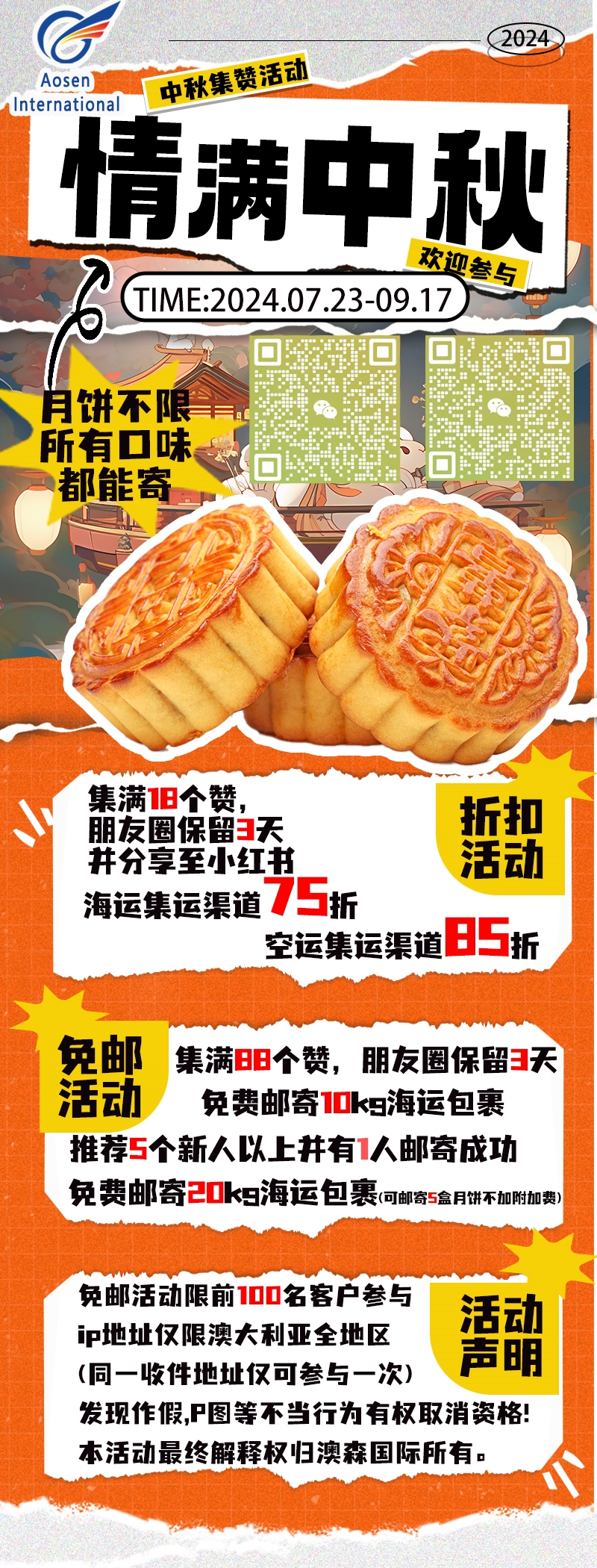 中秋佳节来临之际,为了表达对新老用户的答谢,我司将推出大力优惠活动: 折扣活动:集满18个赞,朋友圈保留3天并分享至小红书:海运集运渠道75折/空运集运渠道85折 免邮活动: (1)集满88个赞,朋友圈保留3天:免费邮寄10kg海运包裹 (2)推荐5个新人以上并有1人邮寄成功:免费邮寄20kg海运包裹(可邮寄5盒月饼不加附加费)